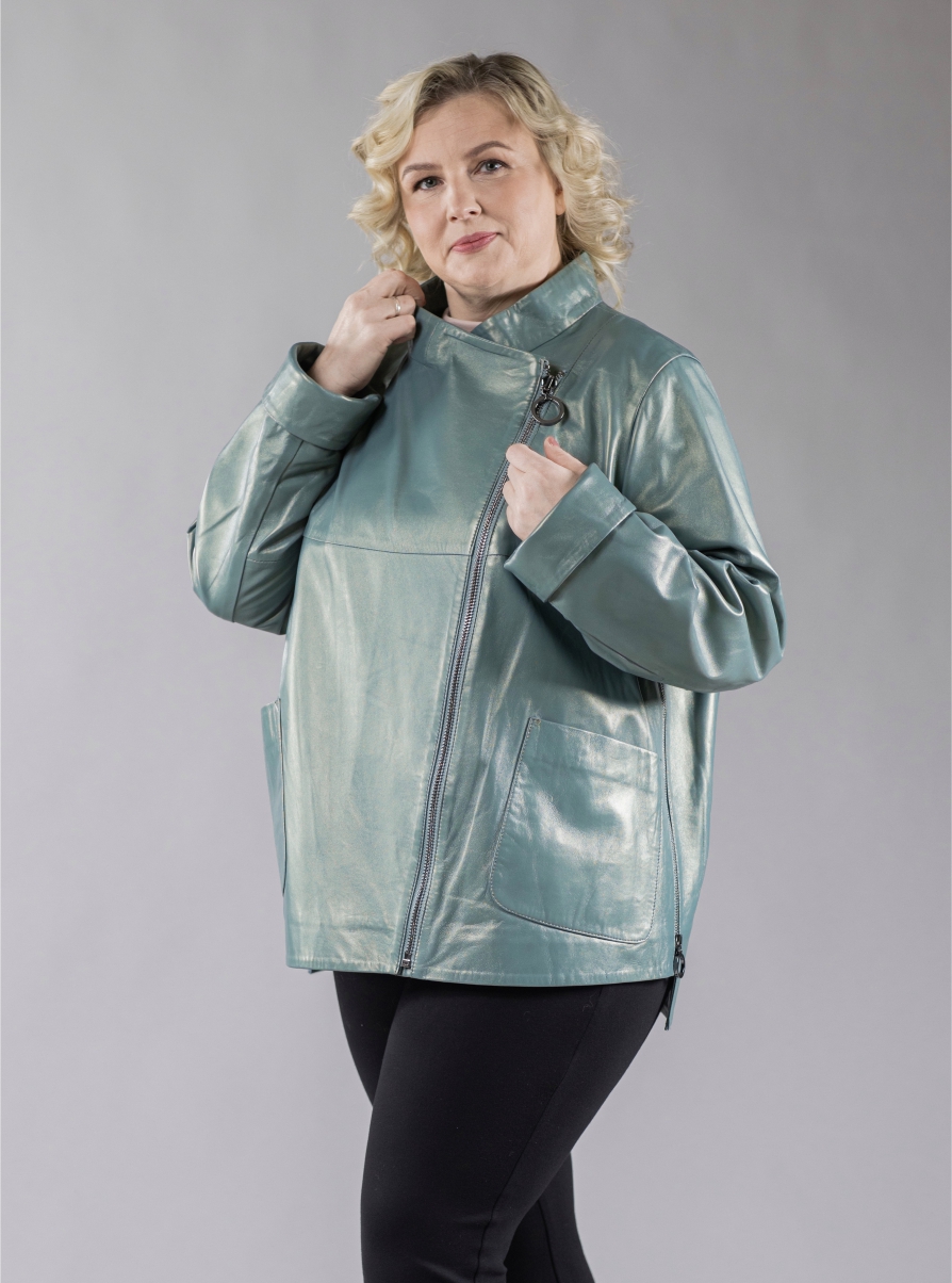 Кожаная куртка в актуальном мятном цвете с косой линией застежки – новинка весенней коллекции сезона 2023 от «Тверской меховой». Куртка «Оливия» объединила в себе все любимые покупательницами элементы кожаной «косухи» в современной аранжировке. Косая застежка-молния позволяет легко менять форму воротника – от аккуратной стойки в полностью застегнутом виде до широкого английского воротника, который можно дополнить ярким шейным платком. Боковые разрезы на молнии и удлиненная спинка смотрятся актуально. Они добавляют комфорта в движении и посадке в автомобиль покупательницам с выразительными бедрами в размерах 50 – 60. Свежий мятный цвет с сияющим перламутровым покрытием заставляет светиться весь образ под стать весеннему настроению. Накладные карманы необычной формы – еще одна пикантная деталь куртки «Оливия». Сочетайте куртку с гардеробом любого стиля и сияйте навстречу весеннему солнцу!Характеристики