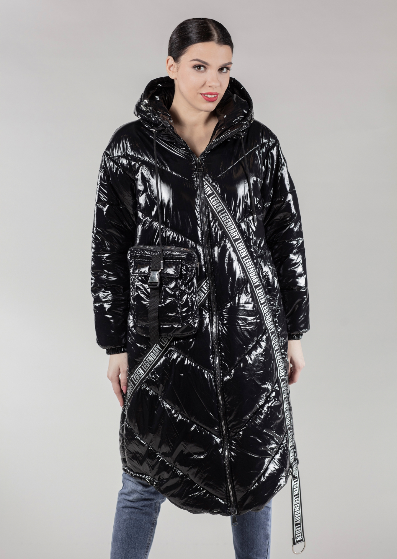 Элегантное пальто-пуховик насыщенного чёрного цвета, выполненное из ткани с лаковым блеском. Характерные детали - ассиметричный закруглённый подол и удобная разъёмная молния. Классический прямой крой подчеркнёт изящность вашего силуэта. Декоративные элементы в виде объёмных карманов и принта-надписи расставляют смелые акценты и придают неповторимости образу.Характеристики